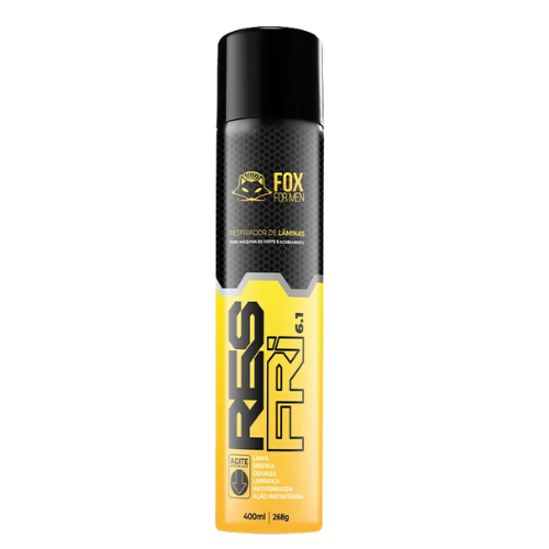 O RESFRI 6.1 de LÂMINAS FOX FOR MEN, limpa, resfria, odoriza, lubrifica, antiferrugem e ação instantânea. Não há necessidade de remover a lâmina da máquina, o spray de alta pressão com jato seco rapidamente expele o cabelo dos dentes da lâmina, outra vantagem é seu aroma bem suave, diferente dos lubrificantes comuns.